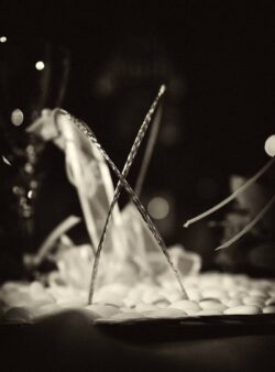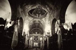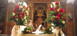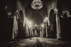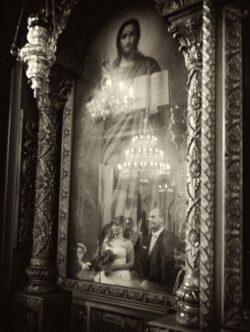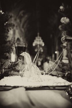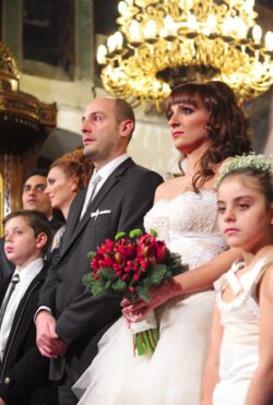 Οι χειμωνιάτικοι γάμοι μπορούν να εντυπωσιάσουν! Στον εσωτερικό στολισμό της εκκλησίας δύο Λαμπάδες Γάμου σε τετράγωνο κερί. Τις λαμπάδες στόλισαν δύο μπουκέτα με κόκκινες αμαρυλλίδες, λευκά τριαντάφυλλα, χρυσάνθεμα και έλατο. Η Νυφική Ανθοδέσμη σε ελεύθερη γραμμή με κόκκινες αμαρυλλίδες, χρυσάνθεμα, υπέρικουμ και έλατο.Με τα ανάλογα λουλούδια στολίστηκαν και το Σετ Γάμου. Τα Στέφανα Γάμου ήταν ασημένια από μία σαγρέ βέργα. Τα κολωνάκια στον διάδρομο της εκκλησίας στολίστηκαν με ιβουάρ δαντέλα.