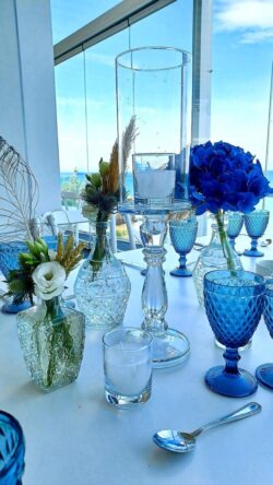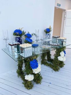 Στην είσοδο του χώρου της δεξίωσης ετοιμάσαμε ένα εντυπωσιακό Candy Bar για τους μικρούς και μεγάλους καλεσμένους. Το τραπέζι ήταν γυάλινο με πόδια ντυμένα από φυσικές πρασινάδες και ορτανσίες. Πάνω σε αυτό τοποθετήσαμε κεραμικά βάζα σε μπλε και λευκό χρώμα με μπουκέτα από τα λουλούδια μας. Διακοσμητικοί δίσκοι και πιατέλες χρησιμοποιήθηκαν για να παρουσιάσουμε τα γλυκά μας όπως γαλλικά macarons, cup cakes, cake pops και κουφέτα. Ο στολισμός των τραπεζιών ήταν με ένα γυάλινο κηροπήγιο στη μέση σε συνδυασμό με τρία γυάλινα βάζα με λεπτομέρεια από τα λουλούδια μας. Επιπλέον κεράκια χρησιμοποιήθηκαν για να δημιουργήσουμε περισσότερη ατμόσφαιρα.