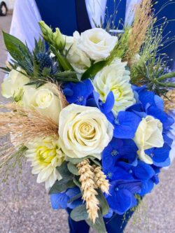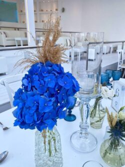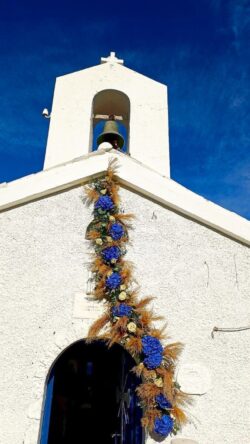 Στολισμός Γάμου και Βάπτισης στον Άγιο Ανδρέα και στο Sea Soul στη Νέα Μάκρη. Ο στολισμός στο ξωκλήσι ήταν εντυπωσιακός με μία γιρλάντα από φυσικά και αποξηραμένα λουλούδια στη πρόσοψη της εκκλησίας. Τα λουλούδια που χρησιμοποιήθηκαν ήταν μπλε ορτανσίες, ερίτζιουμ, λευκά τριαντάφυλλα, λυσίανθος, pampas grass και αποξηραμένα στάχυα. Οι Λαμπάδες Γάμου ήταν σε κερί με στεφάνι από τα λουλούδια μας και η Ανθοδέσμη Γάμου με λευκές ντάλιες. Για τον Στολισμό Κολυμπήθρας χρησιμοποιήσαμε δύο μπουκέτα στα χερούλια με κορδέλες στα χρώματα μας.