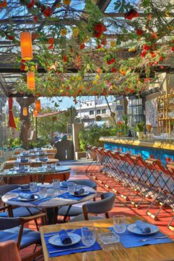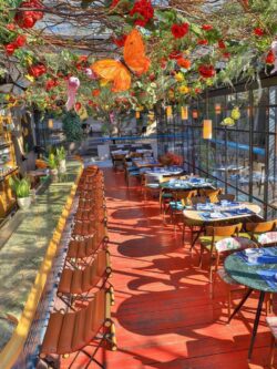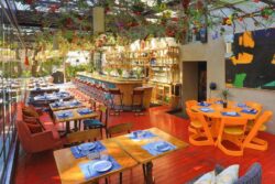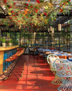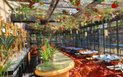 Αυτό που παρατηρεί κάποιος με την πρώτη ματιά είναι η επιβλητική οροφή, διακοσμημένη με πολύχρωμα, υφασμάτινα λουλούδια και φυσικά κλαδιά. Παράλληλα, τοποθετήθηκαν σε πολλά σημεία κασπώ κai γλάστρες με διάφορα φυτά για να δοθεί παντού ο ανοιξιάτικος αέρας που επιθυμούσαμε! Απολαύστε το υλικό που ακολουθεί και ταξιδέψτε σε έναν χώρο γεμάτο χρώματα κι αρώματα!