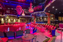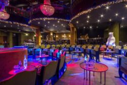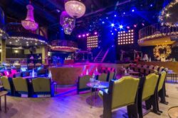 Πάνω από την πίστα κρεμάσαμε δύο εντυπωσιακούς πολυελαίους μεταλλικούς σε χρυσό χρώμα με κρύσταλλα. Ανάμεσα τους μία τεράστια νεκροκεφαλή ντυμένη με κομμάτια από καθρέφτη. Δύο εντυπωσιακά χριστουγεννιάτικα στεφάνια διακοσμήθηκαν στην πλάτη των δύο bar με φωτάκια και στολίδια.