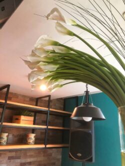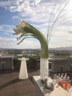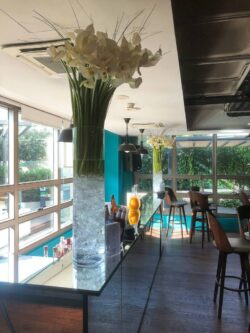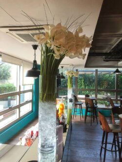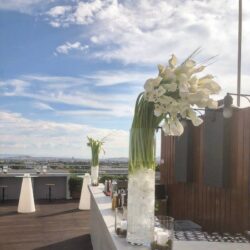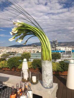Δύο ψηλά βάζα με εντυπωσιακές συνθέσεις από λευκές κάλλες και λεπτομέρεια styl grass διακόσμησαν την reception. Το μπαρ στο εστιατόριο καθώς και το μπαρ στο roof garden του κτηρίου διακοσμήθηκαν ανάλογα. Δεκάδες γυάλες με κεριά και βρύα συμπλήρωσαν την εντυπωσιακή ατμόσφαιρα στην ανοιξιάτικη Αθήνα.