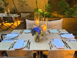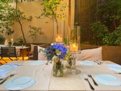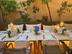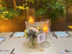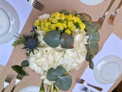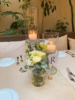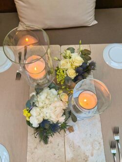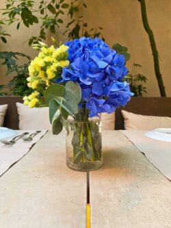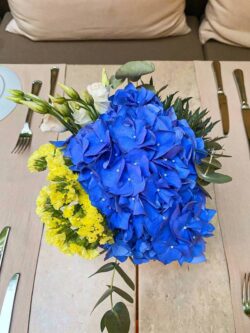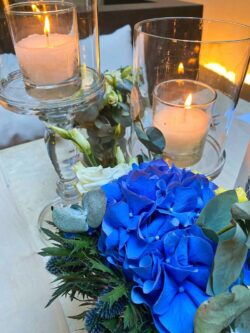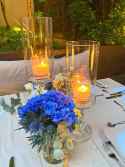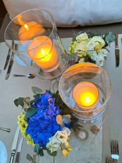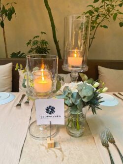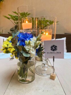 Διακόσμηση συνεδρίου Global Med στο εστιατόριο του μουσείου Γουλανδρή στην Αθήνα. Στο κάθε τραπέζι του εστιατορίου τοποθετήσαμε δύο βάζα με μπουκέτα λουλουδιών. Τα λουλούδια που χρησιμοποιήθηκαν ήταν μπλε και λευκές ορτανσίες, ερίτζιουμ, λυσίανθος και κίτρινος αμάραντος. Τα βάζα πλαισιώθηκαν από δύο γυάλινα άνισα κηροπήγια τα οποία δημιούργησαν μία ξεχωριστή ατμόσφαιρα στο χώρο του εστιατορίου.