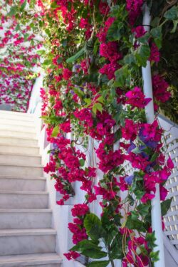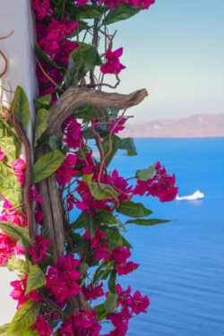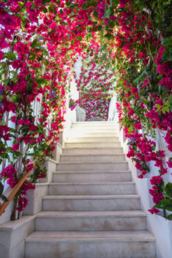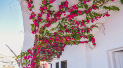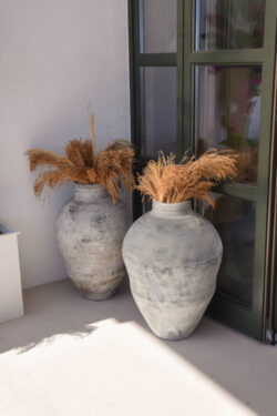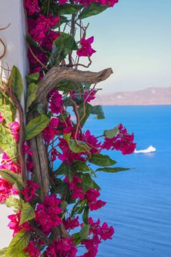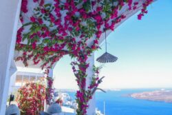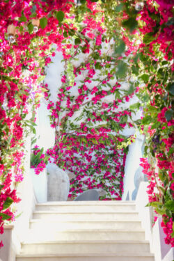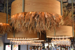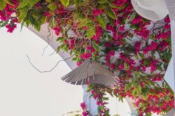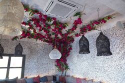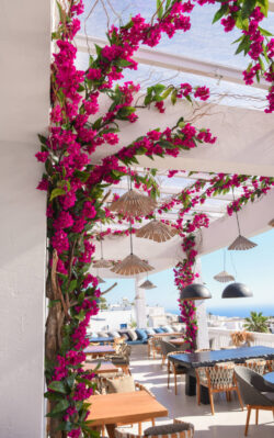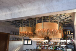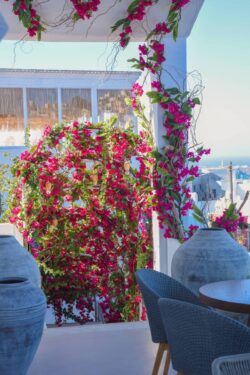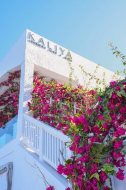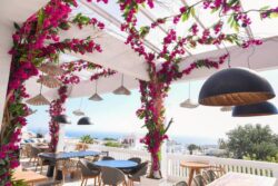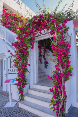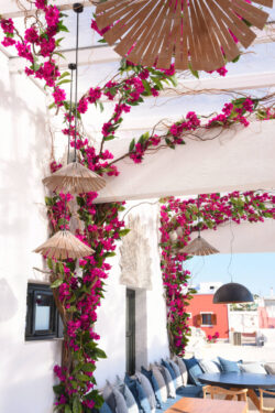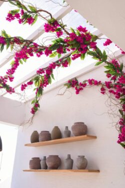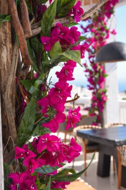 Διακόσμηση με τεχνητά λουλούδια στο Kaliya στη Σαντορίνη ένα δυνατό “new entry” στη νυχτερινή ζωή του νησιού. Στην είσοδο του εστιατορίου και στην αψίδα που υπάρχει εκεί καθώς και στην αψίδα πάνω από τις σκάλες επιλέξαμε να δώσουμε πρώτα απ’ όλα έμφαση. Όλο αυτό το σημείο που είναι και η πρώτη εικόνα του κόσμου που θα επισκεφθεί το μαγαζί. Το σημείο αυτό ντύθηκε με φυσικά ξύλα και τεχνητά λουλούδια βουκαμβίλιας δίνοντας ένα πολύ φυσικό αποτέλεσμα. Στο χώρο του εστιατορίου και στις πέργκολες που υπάρχουν εκεί δημιουργήσαμε δέντρα βουκαμβίλιας. Στην κάθε κολώνα ένα δέντρο από φυσικά ξύλα και τεχνητές βουκαμβίλιες αναρριχώταν. Στον εσωτερικό χώρο του εστιατορίου και πάνω από το bar δημιουργήσαμε εντυπωσιακές συνθέσεις από αποξηραμένα στάχυα και άλλα υλικά. Προσθέσαμε μπουκέτα από αποξηραμένα στάχυα και σε άλλα σημεία του εστιατορίου μέσα σε κασπώ και βάζα.