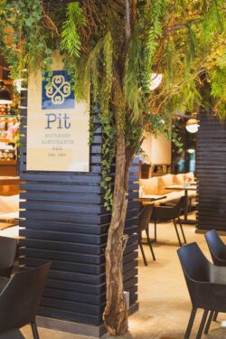 Διακόσμηση με τεχνητά λουλούδια και πρασινάδες στο ανανεωμένο Pit Caffe στο Κολωνάκι. Η διακόσμηση μας επικεντρώθηκε στις κολώνες του εξωτερικού χώρου του μαγαζιού. Σε αυτές χρησιμοποιήσαμε αληθινούς κορμούς δέντρων τους οποίους στολίσαμε με διάφορα είδη από τεχνητές πρασινάδες. Τις πρασινάδες αυτές συνδυάσαμε με φυσικά αποξηραμένα κλαδιά δέντρων τα οποία έδωσαν φυσικό αποτέλεσμα. Στα δύο σταντ καθώς και στα τραπεζάκια δημιουργήσαμε εντυπωσιακά μπουκέτα από φυσικά λουλούδια εποχής.