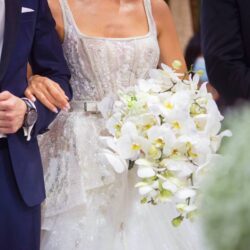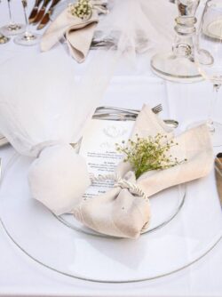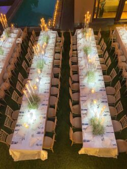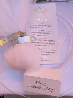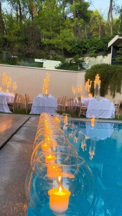 Στολισμός Δεξίωσης Γάμου σε ιδιωτική βίλα στα βόρεια προάστια με επτάκερα κηροπήγια. Τα τραπέζια της δεξίωσης στολίστηκαν με τρία επτάκερα κηροπήγια. Στη βάση του κάθε κηροπηγίου δημιουργήθηκε μια εντυπωσιακή σύνθεση από γυψοφύλλη. Ανάμεσα στα επτάκερα κηροπήγια τοποθετήθηκαν επιπλέον γυάλινα κηροπήγια. Η πισίνα του σπιτιού στολίστηκε με γυάλινες φούσκες με κερί οι οποίες επέπλεαν και πρόσφεραν περισσότερη ατμόσφαιρα στο χώρο. Οι μπομπονιέρες γάμου ήταν λευκές τούλινες με μεταλλική γιρλάντα και κουφέτα Χατζηγιαννάκη. Τα προσκλητήρια γάμου τυπωμένα μενού, η αρίθμηση των τραπεζιών καθώς και τα καρτελάκια με τα ονόματα των καλεσμένων επιλέχθηκαν και υλοποιήθηκαν από το κατάστημα μας. Η ανθοδέσμη γάμου ήταν από λευκά κλαδιά ορχιδέας φαλαίνοψις.