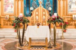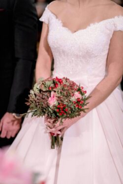 Στον εσωτερικό στολισμό της εκκλησίας, εντυπωσίασαν οι λαμπάδες γάμου με τις χρυσές βάσεις και τις πανέμορφες συνθέσεις λουλουδιών. Το σετ γάμου (δίσκος-ποτήρι-καράφα) επιλέχθηκε από το κατάστημα μας. Τα στέφανα γάμου ήταν ασημένια επίχρυσα από δύο σαγρέ βέργες. Στον εξωτερικό στολισμό της εκκλησία τοποθετήσαμε διακοσμητικά φανάρια χρυσά σε συνδυασμό με χρυσές βάσεις και συνθέσεις λουλουδιών. Το κατακκόκκινο βελούδινο χαλί, απλά ολοκλήρωσε ιδανικά το ατμοσφαιρικό σκηνικό. Η ανθοδέσμη γάμου δημιουργήθηκε από ντάλιες, υπέρικουμ, ίλεξ, έλατο, τριαντάφυλλο, ευκάλυπτο και αντικέ ορτανσίες.