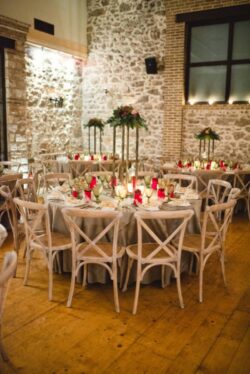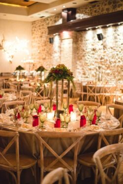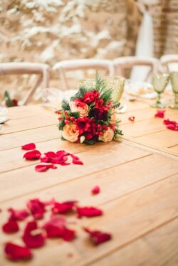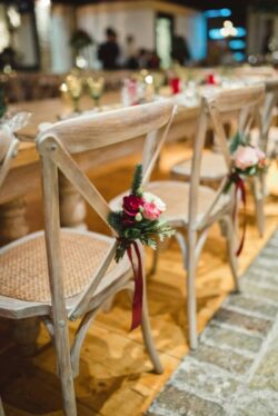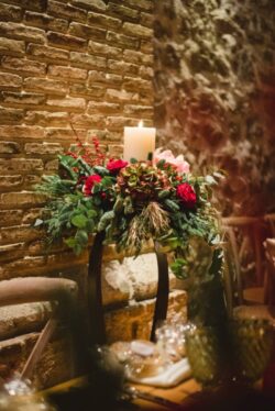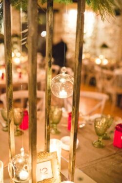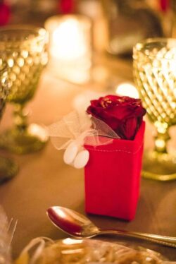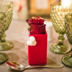 Στη Διακόσμηση της Δεξίωσης, οι μπρονζέ βάσεις με τις συνθέσεις, τις κρεμαστές γυάλινες μπάλες με φωτάκια led στο εσωτερικό, ήταν απλά εκθαμβωτικές! Η λεπτομέρεια για τις καρέκλες του γαμπρού και της νύφης με μικρά μπουκετάκια λουλουδιών και βυσσινί, βελούδινη κορδέλα έκανε την διαφορά… Οι μπομπονιέρες γάμου που επιλέχθηκαν ήταν ένα βελούδινο, κόκκινο κουτί με αληθινό τριαντάφυλλο και λεπτομέρεια από χρυσό και τρία κουφέτα. Δείτε τις φωτογραφίες που ακολουθούν και μεταφερθείτε κι εσείς στο χριστουγεννιάτικο, μαγευτικό σκηνικό αυτού του υπέροχου γάμου!