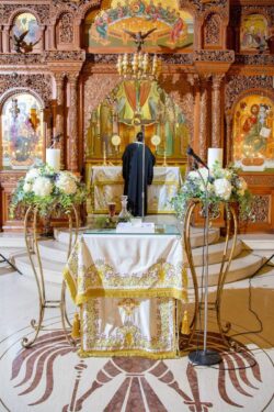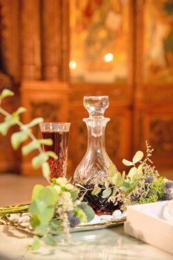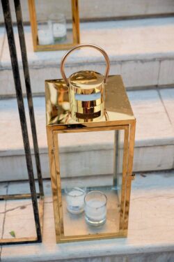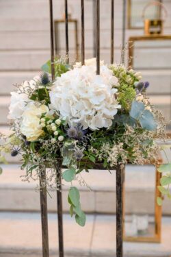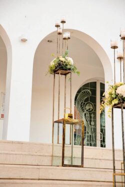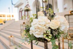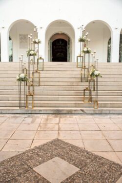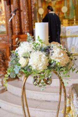 Στολισμός Εκκλησίας Γάμου με χρυσές ανθοστήλες και φανάρια. Στον εξωτερικό στολισμό της εκκλησίας επικεντρωθήκαμε στα σκαλιά όπου δημιουργήσαμε ένα νοητό διάδρομο. Στην κάθε πλευρά τοποθετήσαμε 3 μεταλλικές χρυσές ανθοστήλες με συνθέσεις λουλουδιών και πεντάκερα κηροπήγια στο πάνω μέρος. Τα λουλούδια που χρησιμοποιήθηκαν ήταν λευκές ορτανσίες, λευκά τριαντάφυλλα, υπέρικουμ, λιμόνιουμ ερίτζιουμ και ευκάλυπτο. Στην κάθε πλευρά τοποθετήσαμε και 6 μεταλλικά χρυσά διακοσμητικά φανάρια με κεριά για περισσότερη ατμόσφαιρα. Στο εσωτερικό του ναού τοποθετήσαμε τις λαμπάδες γάμου οι οποίες ήταν σε μεταλλικές χρυσές ανθοστήλες σε κλασική γραμμή. Οι συνθέσεις μεγάλες και εντυπωσιακές από τα λουλούδια που χρησιμοποιήσαμε και στις ανθοστήλες του εξωτερικού χώρου. Η ανθοδέσμη γάμου ήταν σε ελεύθερη γραμμή με τα λουλούδια μας. Το σετ γάμου καθώς και τα στέφανα γάμου επιλέχθηκαν όλα από το ηλεκτρονικό μας κατάστημα NEDAshop.gr και στολίστηκαν και αυτά με λεπτομέρεια λουλουδιού.