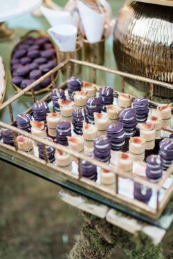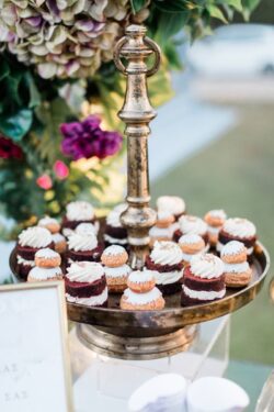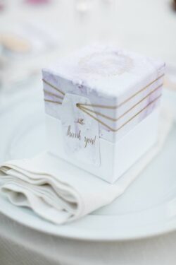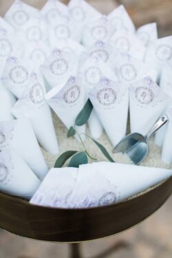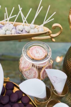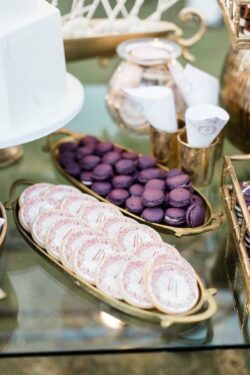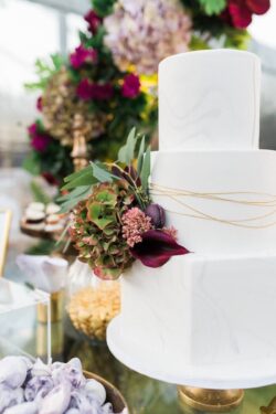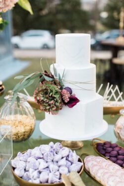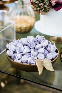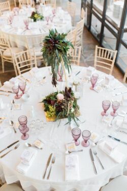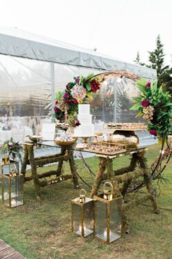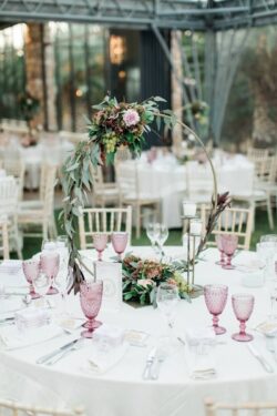Ο στολισμός δεξίωσης που βρισκόταν ακριβώς δίπλα από την εκκλησία ακολούθησε την αισθητική της εκκλησίας. Οι μισές ροτόντες στολίστηκαν με μεταλλική ψηλή βάση και υπόλοιπες με ένα μεταλλικό κύκλο και τα δύο σε χρυσό χρώμα. Κεριά σε ποτήρι πάνω σε μεταλλικά χρυσά κηροπήγια πλαισίωσαν την κεντρική κατασκευή. Τα λουλούδια που χρησιμοποιήθηκαν ήταν τα ίδια με την εκκλησία. Οι μπομπονιέρες γάμου ήταν σε χάρτινο κουτί δεμένο με χρυσό κορδόνι. Στην είσοδο της δεξίωσης τοποθετήθηκε ένας φωτιζόμενος κύκλος με τεχνητά λουλούδια στα χρώματα του γάμου. Μπροστά του φτιάξαμε ένα εντυπωσιακό candy bar με διακοσμητικούς δίσκους με γλυκά και κουφέτα. Μερικά φανάρια προστέθηκαν για επιπλέον ατμόσφαιρα.