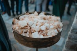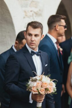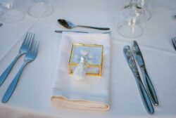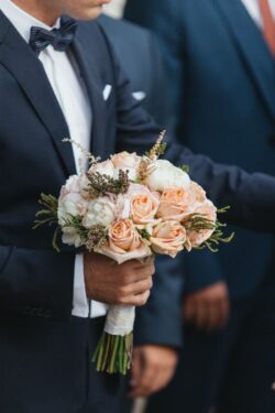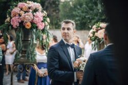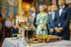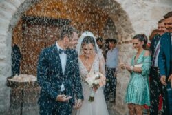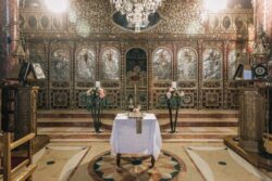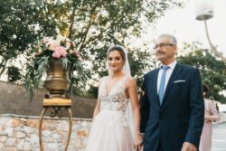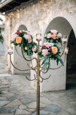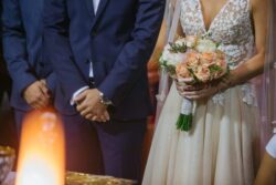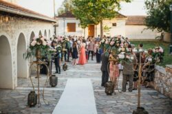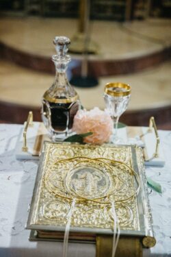 Στο εσωτερικό της εκκλησίας τοποθετήθηκαν οι λαμπάδες γάμου οι οποίες ήταν σε χρυσές ανθοστήλες με ελαφρώς κρεμαστές συνθέσεις και κεριά. Το σετ γάμου επιλέχθηκε και αυτό από το κατάστημα μας. Ο δίσκος γάμου ήταν λευκός μαρμάρινος με χρυσά χερούλια. Η καράφα και το ποτήρι κρυστάλλινα με χρυσές λεπτομέρειες. Από τις λεπτομέρειες που ξεχώρισαν ήταν η κουάφ νύφης καθώς και η μπουτονιέρα του γαμπρού. Ακόμα, στην έξοδο της εκκλησίας τοποθετήσαμε ένα χρυσό μανουάλι με πουγκάκια ρυζιού.