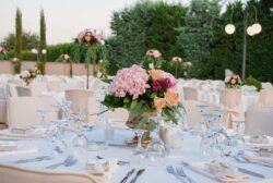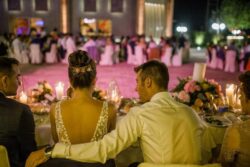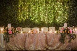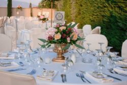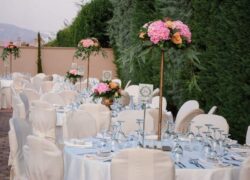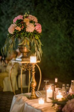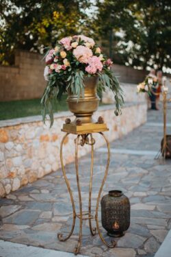 Ο χώρος που επέλεξε το ζευγάρι ήταν το Principal Hall στα προάστια της Λάρισας. Ένας ξεχωριστός χώρος με πολύ φιλόξενο προσωπικό και ιδιοκτήτες. Οι μισές ροτόντες διακοσμήθηκαν με χρυσούς κεραμικούς αμφορείς και οι άλλες μισές με μεταλλικές χρυσές βάσεις. Πάνω τους υπήρχαν εντυπωσιακές συνθέσεις λουλουδιών ελαφρώς κρεμαστές. Περιμετρικά υπήρχαν κεράκια ώστε να δημιουργήσουμε περισσότερη ατμόσφαιρα. Το νυφικό τραπέζι και ο διάδρομος στην είσοδο του χώρου στολίστηκαν με τις ανθοστήλες και τις συνθέσεις από την εκκλησία.
