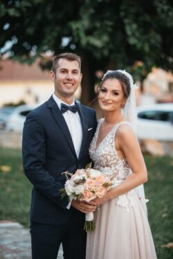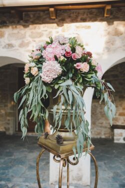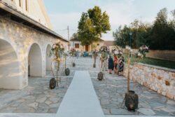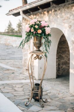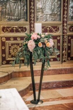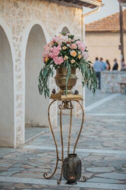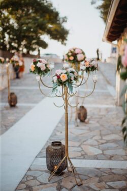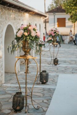 Η Μαρία και ο Αλέξανδρος επέλεξαν την εκκλησία του Άγιου Χαράλαμπου στη Νίκαια της Λάρισας για την πιο ξεχωριστή μέρα της ζωής τους. Στον εξωτερικό στολισμό εκκλησίας τοποθετήθηκαν συνολικά επτά ψηλές ανθοστήλες σε χρυσό χρώμα με λουλούδια τοποθετημένες ασύμμετρα. Οι τρεις από αυτές ήταν σε κλασική γραμμή με εντυπωσιακούς αμφορείς στο πάνω μέρος και συνθέσεις από λουλούδια. Τοποθετήθηκαν επίσης, δύο ψηλά εννιάκερα κηροπήγια τα οποία είχαν λεπτομέρεια λουλουδιού αλλά και κερί για περισσότερη ατμόσφαιρα.. Δύο ψηλοί αμφορείς με συνθέσεις λουλουδιών και διακοσμητικά φανάρια ολοκλήρωσαν την εντυπωσιακή διακόσμηση. Η νυφική ανθοδέσμη ήταν από λευκές παιώνιες, σομόν τριαντάφυλλα, ροζ ορτανσίες και σαφάρι. Τα λουλούδια αυτά μαζί με ευκάλυπτο χρησιμοποιήθηκαν και στον υπόλοιπο στολισμό.