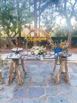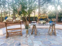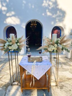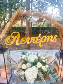 Στολισμός Γάμου στον Άγιο Γεώργιο στο Καβούρι με Pampas Grass. Μια εντυπωσιακή είσοδο στον εξωτερικό στολισμό της εκκλησίας ετοιμάσαμε για τον συγκεκριμένο γάμο. Δυο ψηλές εντυπωσιακές συνθέσεις από συνδυασμό αποξηραμένων και φυσικών λουλουδιών με βάση το pampas grass. Οι λαμπάδες γάμου ακολούθησαν την ίδια φιλοσοφία με εντυπωσιακές συνθέσεις πάνω σε μεταλλικές χρυσές βάσεις σε minimal γραμμή. Μετά το τέλος του γάμου ετοιμάσαμε ένα ξεχωριστό candy bar για τη βάπτιση του μικρού Λευτέρη. Πάνω σε αυτό τοποθετήσαμε ένα μεταλλικό κύκλο με το όνομα του παιδιού, λουλούδια και διακοσμητικούς δίσκους με γλυκά. Δίπλα σε αυτό τοποθετήσαμε ένα ξύλινο τραπέζι για να παρουσιάσουμε τις μπομπονιέρες γάμου.