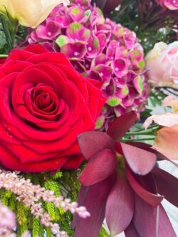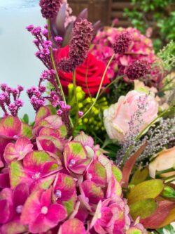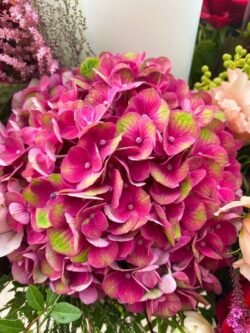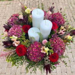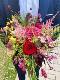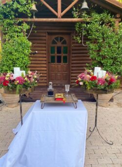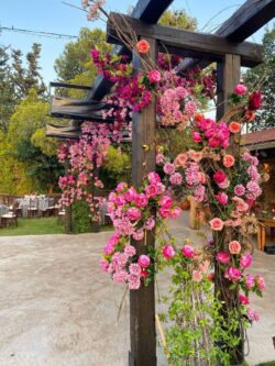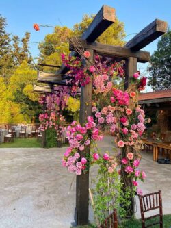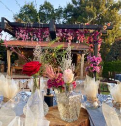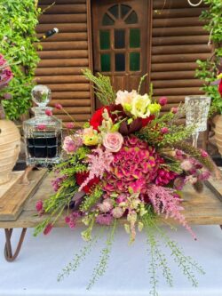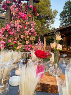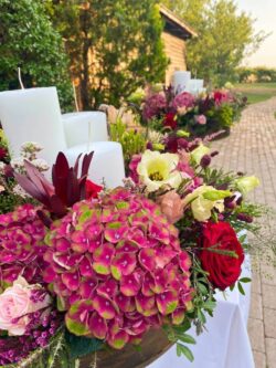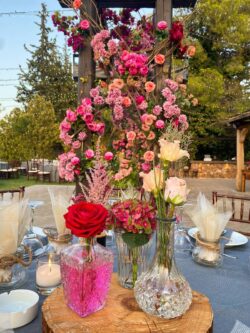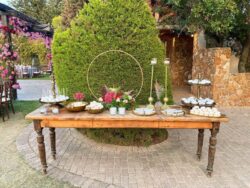 Περπατώντας από το χώρο της εκκλησίας προς τη δεξίωση είχαμε ετοιμάσει ένα candy bar πάνω στο ξύλινο τραπέζι που μας παραχώρησε ο χώρος. Πάνω στο τραπέζι υπήρχαν διακοσμητικοί δίσκοι και πιατέλες με γλυκά, κηροπήγια με κεριά, γυάλινα βάζα με κουφέτα. Ένας εντυπωσιακός κύκλος με σύνθεση από τα λουλούδια μας ολοκλήρωσε τη διακόσμηση. Τα τραπέζια του γάμου είχαν στολιστεί με μία ξύλινη ροδέλα που την παρείχε ο χώρος και τρία ασύμμετρα βαζάκια με λουλούδια. Τα μπουκέτα στο κάθε βαζάκι ήταν διαφορετικά μεταξύ τους τόσο χρωματικά όσο και στα είδη των λουλουδιών. Πάνω από την πίστα δέσποζε ένα εντυπωσιακό installation πάνω στην πέργκολα. Η πέργκολα είχε ντυθεί με φυσικά ξύλα και τεχνητά λουλούδια σε αποχρώσεις όπως και τα φυσικά λουλούδια που χρησιμοποιήσαμε.