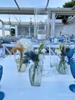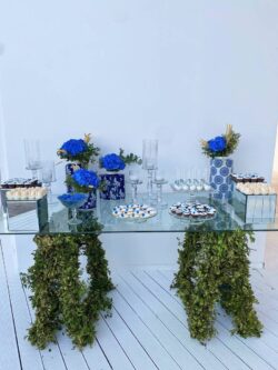 Στην είσοδο του χώρου της δεξίωσης ετοιμάσαμε ένα εντυπωσιακό candy bar για τους μικρούς και μεγάλους καλεσμένους. Το τραπέζι ήταν γυάλινο με πόδια ντυμένα από φυσικές πρασινάδες και ορτανσίες. Πάνω σε αυτό τοποθετήσαμε κεραμικά βάζα σε μπλε και λευκό χρώμα με μπουκέτα από τα λουλούδια μας διακοσμητικοί δίσκοι και πιατέλες χρησιμοποιήθηκαν για να παρουσιάσουμε τα γλυκά μας όπως γαλλικά macarons, cup cakes, cake pops και κουφέτα. Ο στολισμός των τραπεζιών ήταν με ένα γυάλινο κηροπήγιο στη μέση σε συνδυασμό με τρία γυάλινα βάζα με λεπτομέρεια από τα λουλούδια μας. Επιπλέον κεράκια χρησιμοποιήθηκαν για να δημιουργήσουμε περισσότερη ατμόσφαιρα.