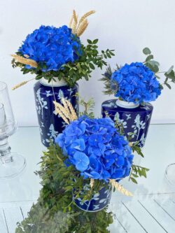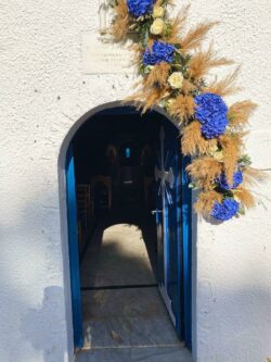 Στολισμός Γάμου και Βάπτισης στον Άγιο Ανδρέα και στο Sea Soul στη Νέα Μάκρη. Ο στολισμός στο ξωκλήσι ήταν εντυπωσιακός με μία γιρλάντα από φυσικά και αποξηραμένα λουλούδια στη πρόσοψη της εκκλησίας. Τα λουλούδια που χρησιμοποιήθηκαν ήταν μπλε ορτανσίες, ερίτζιουμ, λευκά τριαντάφυλλα, λυσίανθος, pampas grass και αποξηραμένα στάχυα. Οι λαμπάδες γάμου ήταν σε κερί με στεφάνι από τα λουλούδια μας και η ανθοδέσμη γάμου με λευκές ντάλιες. Για τον στολισμό κολυμπήθρας χρησιμοποιήσαμε δύο μπουκέτα στα χερούλια με κορδέλες στα χρώματα μας.