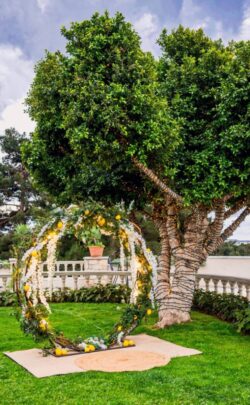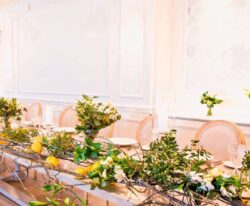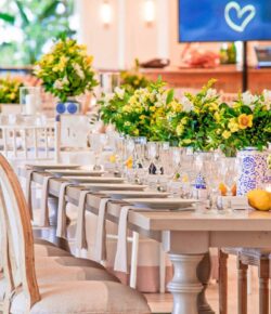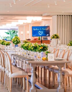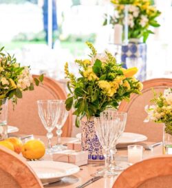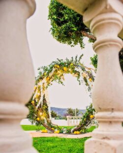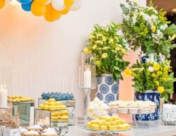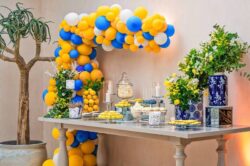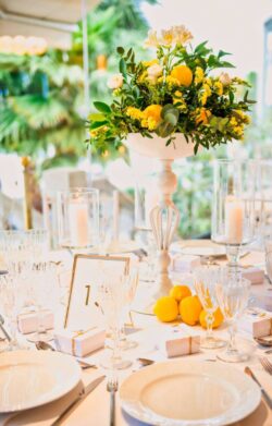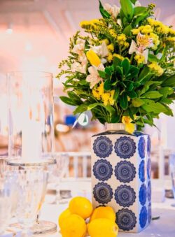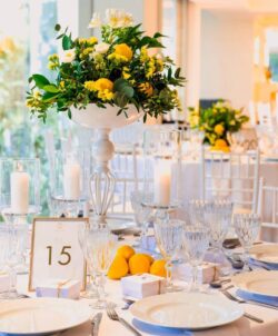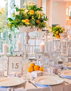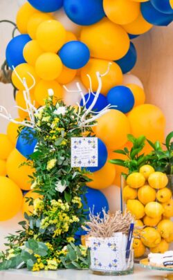 Στολισμός Γάμου και Βάπτισης στο Golf της Γλυφάδας έχοντας δημιουργήσει το απόλυτα καλοκαιρινό setting με τον συνδυασμό του μπλε και του κίτρινου που απογείωσε την βάφτιση αυτή στο Golf της Γλυφάδας. Ένα μοναδικό candy bar στήθηκε με λεπτεπίλεπτα ανθάκια σε κίτρινο χρώμα, μέσα σε μοναδικά βάζα me Chinese pattern. Το πλαισίωσε μία εντυπωσιακή αψίδα μπαλονιών στην ίδια χρωματική παλέτα. Τα τραπέζια των καλεσμένων διακοσμήθηκαν με ξεχωριστά βάζα στο ίδιο μοτίβο και αντίστοιχα μπουκέτα λουλουδιών. Τα υπόλοιπα που ήταν στρογγυλά διακοσμήθηκαν με ιδιαίτερη ψηλή βάση και σύνθεση από τα λουλούδια μας. Όλες οι κατασκευές πλαισιώθηκαν με τρία γυάλινα κηροπήγια. Ένας εντυπωσιακός, μεταλλικός κύκλος με λευκά τεχνητά λουλούδια, πρασινάδα και λεμόνια ολοκλήρωσε με μοναδικό τρόπο τον στολισμό μας. Η λεπτομέρεια από λεμόνια, τόσο στα τραπέζια των καλεσμένων, όσο και στον κύκλο, απογείωσε τον στολισμό δίνοντας μία νότα καλοκαιρινής φρεσκάδας.