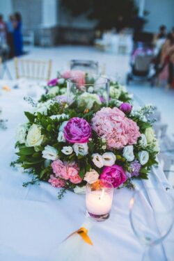 Στολισμός Γάμου στο Αμάλθεια Βάρκιζα Resort. Ο στολισμός των τραπεζιών γάμου ήταν από μεταλλικό ασημένιο βάζο με μπουκέτο λουλουδιών. Τα λουλούδια που χρησιμοποιήθηκαν ήταν λευκές και ροζ ορτανσίες, φούξια παιώνιες, τριαντάφυλλα, λυσίανθο και άστερ. Οι μπομπονιέρες γάμου ήταν σε τούλι με κουφέτα βότσαλα και δέσιμο από μεταλλικό χρυσό έλασμα. Ο στολισμός στο νυφικό τραπέζι ήταν με τις συνθέσεις από τις λαμπάδες γάμου σε συνδυασμό με λευκά ξύλινα φανάρια στο μπροστά μέρος. Η ανθοδέσμη γάμου ήταν από παιώνιες, ορτανσίες και τριαντάφυλλα. Το Βιβλίο Ευχών ήταν ξύλινο δερματόδετο με χρυσή καρδιά στην πρόσοψη.