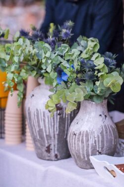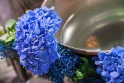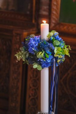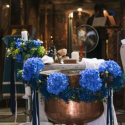 Στολισμός Βάπτισης για αγόρι στον Άγιο Ιωάννη Λουμπαρδιάρη. Για το στολισμό κολυμπήθρας επιλέξαμε μια ιδιαίτερη γιρλάντα από μπλε γυψοφύλλη σε συνδυασμό με μπλε ορτανσίες. Σε απόλυτη αρμονία ήταν και η λαμπάδα μας πίσω από την κολυμπήθρα. Οι μπομπονιέρες βάπτισης ήταν σε ένα πουγκί στο χρώμα της άμμου με μπλε κορδέλα. Τα μαρτυρικά βάπτισης ήταν με μπλε κορδόνι και ένα χρυσό σταυρουδάκι. Ένα μικρό refreshment που δημιουργήσαμε έξω από την εκκλησία διακοσμήθηκε με δύο ιδιαίτερα βάζα με μπουκέτα στα χρώματα μας.