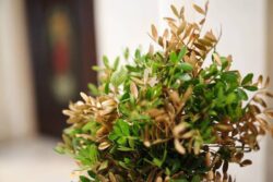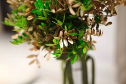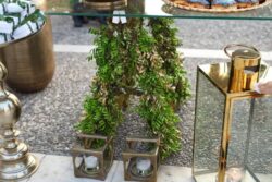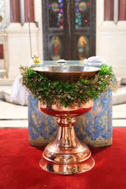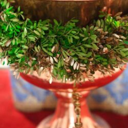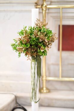 Στο εσωτερικό του ναού ο στολισμός κολυμπήθρας για το αγόρι μας τον Αντώνη έγινε με γιρλάντα από σκίνο και κάποια κλαδιά βαμμένα σε χρυσό χρώμα. Με πινελιές από σκίνο στολίστηκε επίσης και η Λαμπάδα Βάπτισης καθώς και το σετ βάπτισης. Τα μαρτυρικά βάπτισης ήταν φινιρισμένα με λαδί κορδόνι και ένα ιδιαίτερο χρυσό σταυρουδάκι.