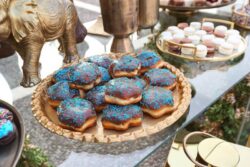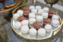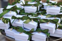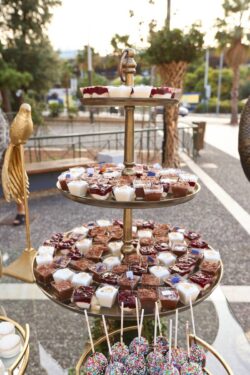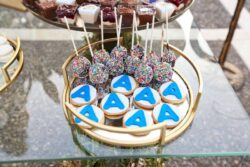 Στην έξοδο την εκκλησίας τοποθετήσαμε το candy bar της βάπτισης, πάνω σε ένα γυάλινο τραπέζι με τη βάση του να είναι επίσης ντυμένη με σκίνο. Πάνω σε αυτό μεταφέραμε κάποια από τα αντικείμενα που στόλισαν τον προαύλιο χώρο της εκκλησίας. δίσκοι διακοσμητικοί με γλυκά και δύο σταντ για τα παγωμένα νεράκια και τις μπομπονιέρες βάπτισης ολοκλήρωσαν ιδανικά αυτή την άκρως εντυπωσιακή διακόσμηση. Η μπομπονιέρα που επιλέξαμε σε λευκό ιριδίζον κουτί δεμένο με λαδί φιόγκο και ένα χρυσό άλφα.