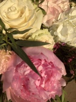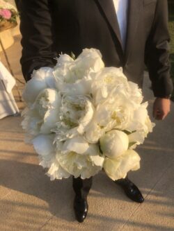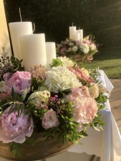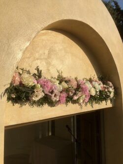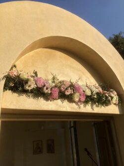 Στον Στολισμό Εκκλησίας τοποθετήθηκαν τρία ενιάκερα κηροπήγια σε χρυσό χρώμα. Πάνω στο κάθε κηροπήγιο τοποθετήθηκαν εντυπωσιακές συνθέσεις από γυψοφύλλη (Baby’s Breath) και λαμπάκια σε σύρμα. Μπροστά στην εκκλησία τοποθετήθηκε το τραπέζι του μυστηρίου με το δίσκο γάμου, το ποτήρι, την καράφα και τα Στέφανα Γάμου. Το Σετ Γάμου είχε επιλεγεί από την πλούσια συλλογή του καταστήματος μας. Αριστερά και Δεξιά οι Λαμπάδες Γάμου σε μανουάλια σε χρυσό χρώμα με εντυπωσιακές συνθέσεις και τρία κεριά. Τα λουλούδια που χρησιμοποιήθηκαν για τις συνθέσεις ήταν ορτανσίες σε λευκό και ροζ χρώμα, ροζ παιώνιες, λευκά τριαντάφυλλα, λυσίανθος, αστίλμπ, υπέρικουμ και wax. Με τα ίδια λουλούδια στολίστηκε και η αψίδα πάνω από την είσοδο της εκκλησίας. Η Νυφική Ανθοδέσμη ήταν από λευκές παιώνιες.