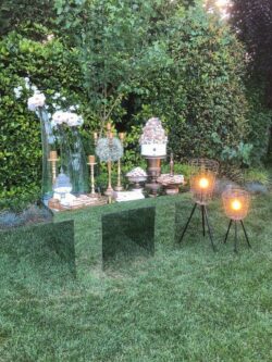 Στην είσοδο της δεξίωσης ένα εντυπωσιακό Candy Bar με δίσκους με γλυκά, κηροπήγια και γυάλες με λουλούδια. Δίπλα στο candy bar ένας εντυπωσιακός φωτιζόμενος κύκλος με υφασμάτινα λουλούδια που χρησιμοποιήθηκε σαν Photo Booth για τις αναμνηστικές φωτογραφίες των καλεσμένων. Τα τραπέζια των καλεσμένων στολίστηκαν με τετράγωνους καθρέφτες, γυαλάκια με κερί και χρυσά γυαλάκια με γυψοφύλλη και ευκάλυπτο. Επίσης τοποθετήθηκε και μία ψηλή χρυσή μεταλλική βάση με σύνθεση από γυψοφύλλη (Baby’s Breath) και λαμπάκια δίνοντας την αίσθηση σύννεφου που αιωρείται πάνω από το τραπέζι.