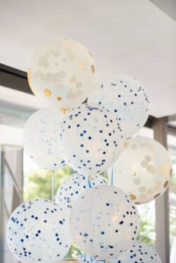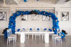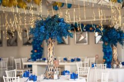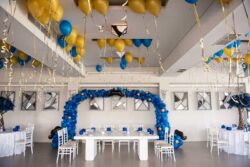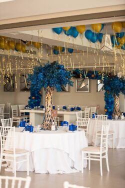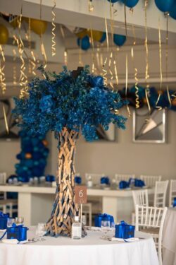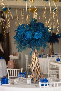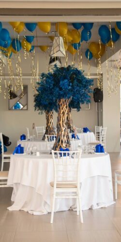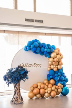 Τα τραπέζια των καλεσμένων στολίστηκαν με ξύλινα δέντρα με εντυπωσιακές συνθέσεις από πρασινάδες και λουλούδια σε μπλε πετρόλ απόχρωση. Επίσης μπροστά από τον κάθε καλεσμένο τοποθετήσαμε την Μπομπονιέρα Βάπτισης. Οι μπομπονιέρες ήταν σε μπλε πετρόλ κουτί δεμένο με σατέν κορδέλα και ξύλινο μαύρο μουστάκι. Στο δέσιμο βάλαμε ένα μπλε ματάκι ενώ μέσα υπήρχαν διάφορα γλυκά όπως κουφέτα, marshmallow και smarties. Δεκάδες μπαλόνια σε μπλε και χρυσό χρώμα στόλισαν τον ουρανό του χώρου. Μία εντυπωσιακή αψίδα από μπαλόνια τοποθετήθηκε πίσω από το τραπέζι των γονιών. Από μπαλόνια στολίστηκε και ο κύκλος μας που έγραφε το όνομα του μικρού αγοριού. Πλαισιώθηκε από ένα ξύλινο δέντρο όπως αυτά που χρησιμοποιήσαμε στα τραπέζια. Ιδανικό για να φωτογραφηθούν οι καλεσμένοι μας.
