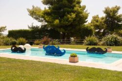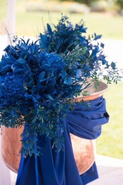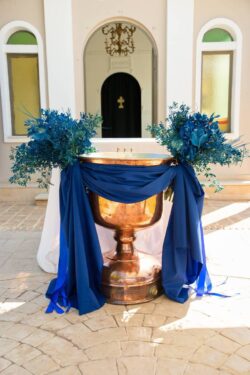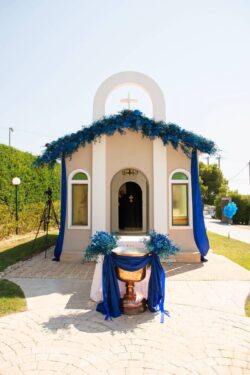 Μια εντυπωσιακή και διαφορετική Βάπτιση για αγόρι με θέμα το Μουστάκι θα σας παρουσιάσουμε σήμερα. Ο Στολισμός Βάπτισης έγινε στο Κτήμα και είχε για χρώμα το μπλε πετρόλ. Ο Στολισμός Εκκλησίας είχε μια εντυπωσιακή αψίδα στο πάνω μέρος και όχι περιμετρικά της πόρτας όπως συνηθίζεται. Η γιρλάντα ήταν από φυσικά ξύλα, πρασινάδες και λουλούδια βαμμένα σε μπλε πετρόλ απόχρωση. Στα δύο άκρα της γιρλάντας κρεμάσαμε υφάσματα στην ίδια απόχρωση. Ο Στολισμός Κολυμπήθρας για το αγόρι μας τον Αλέξανδρο ήταν με ύφασμα στη μέση και δύο εντυπωσιακά μπουκέτα στα χερούλια σε ανάλογη αισθητική με την αψίδα μας. Στη διαδρομή από την εκκλησία προς τη δεξίωση στολίσαμε και την πισίνα με εντυπωσιακές κατασκευές να επιπλέουν με μουστάκια σε μαύρο και μπλε χρώμα.